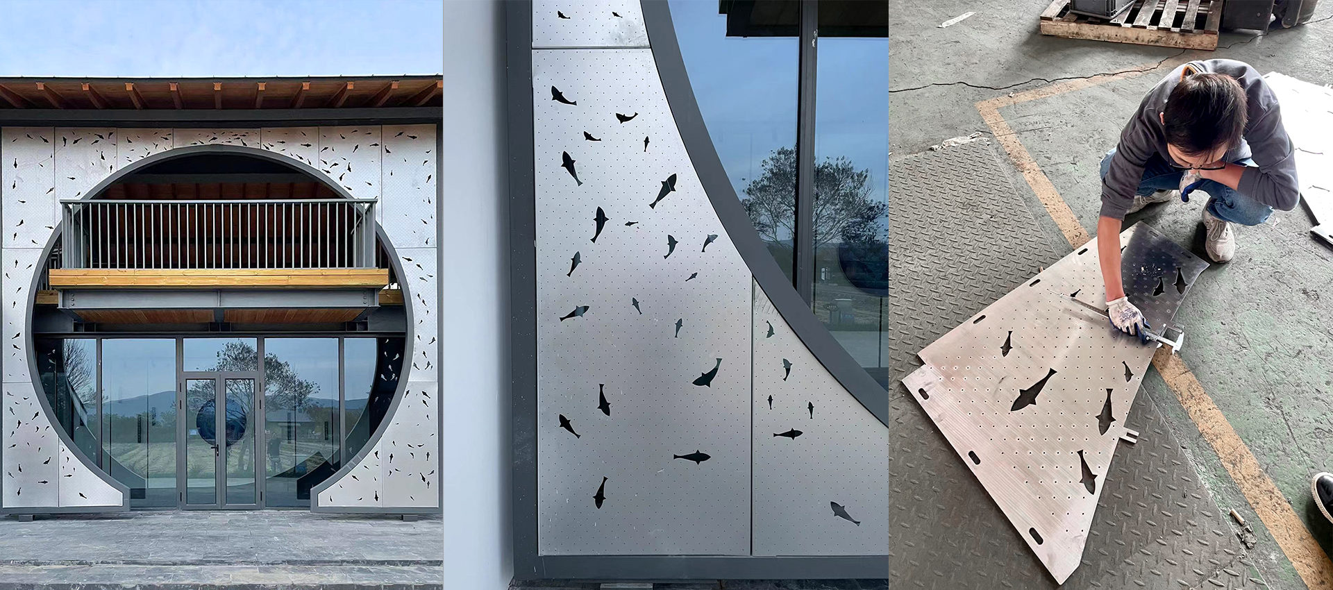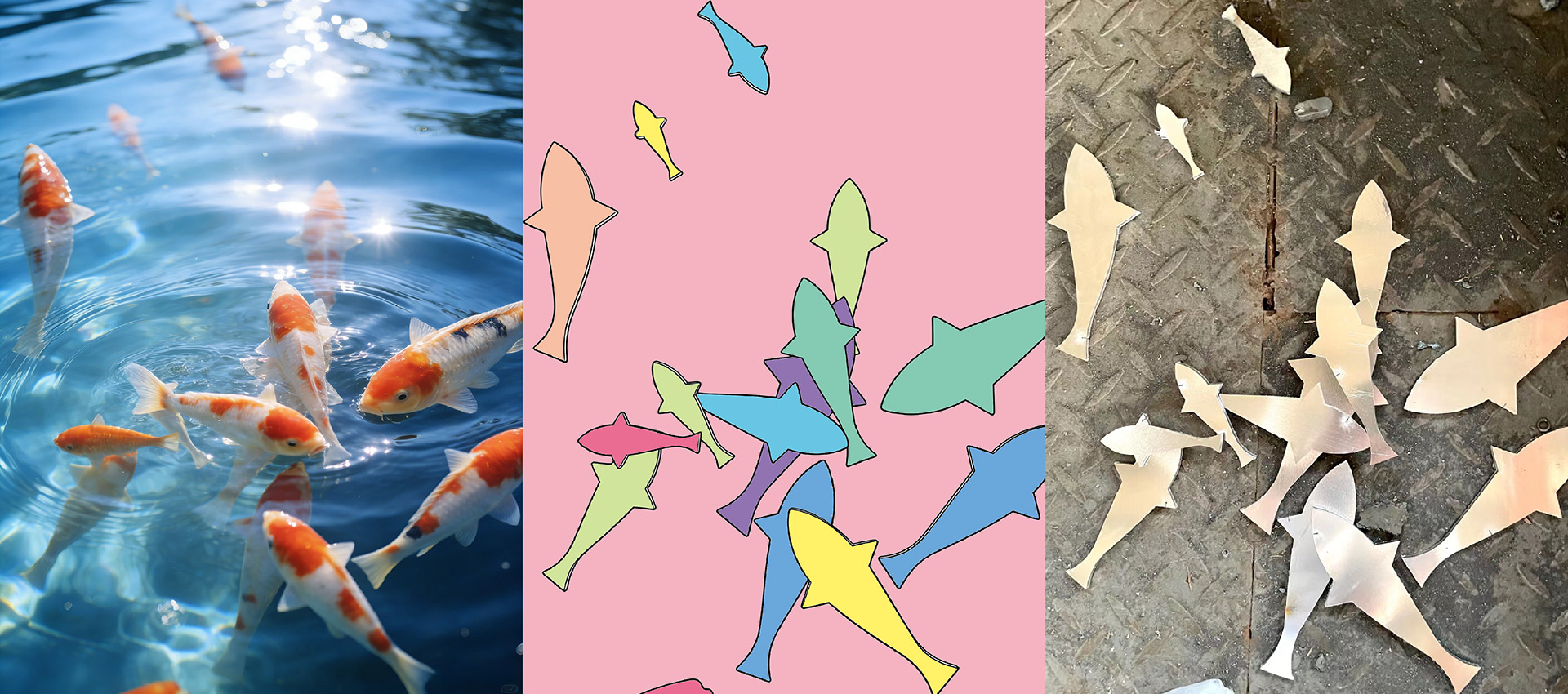本项目是一座农业科技展示馆的附带门洞设计,结合了中式园林常见的月拱门和锦鲤游曳的意象。我主要负责建筑施工图的绘制和月拱门面板设计工作。应镇长要求,面板需以具象化的游鱼图案为核心元素,以此呼应本地农业特色。为实现这一目标,项目采用多智能体系统模拟鱼群动态——系统中的每个个体会根据距离、聚集与对齐等规则,自主调整位置、速度、形态及游动方向。关键步骤在于捕捉超过200条鱼围绕门洞灵动游动的瞬间画面,将该动态场景转换为DXF格式文件供激光雕刻机使用。面板在金属加工厂完成加工,并在施工现场组装成型。项目展现了多智能体系统在模拟生物群体行为上的仿生能力,验证了“自动生成图案-DXF文件-激光雕刻”全流程的可行性.这一流程无需依赖AutoCAD手动绘图,即可实现立面图案的多样化定制,大幅提升了设计与生产的效率。