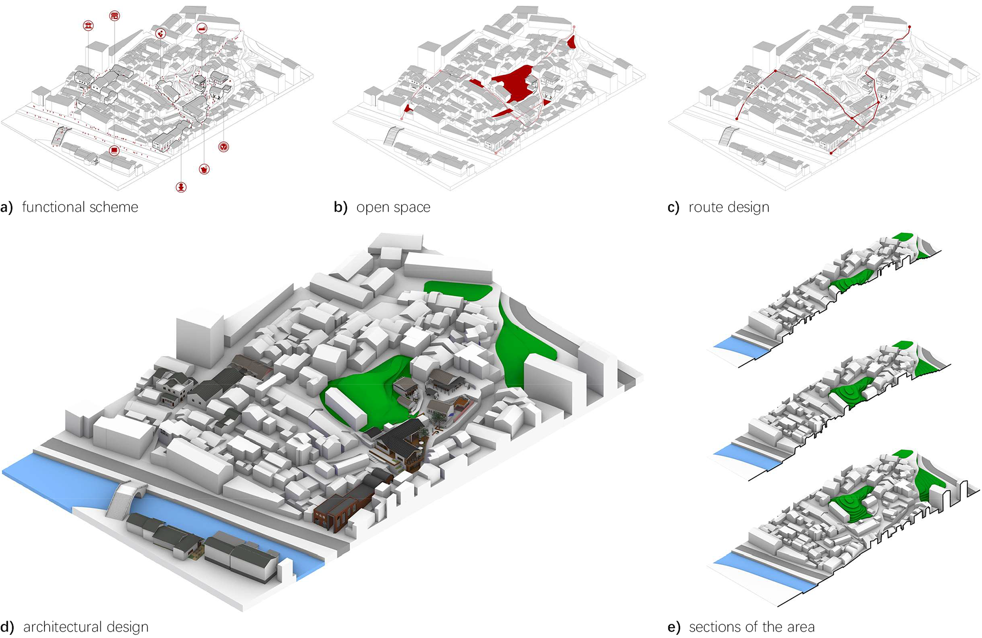 在该技术框架的支持下,我们已完成对江苏省某小镇的历史遗址调查与区域更新设计。该项目聚焦一座小山上的复杂区域——因该区域被城市空间环绕,自身又呈现高密度村落特征,可视为城中村。该城中村的保护与再生需开展详尽场地调查、整体规划、后续建筑设计,并兼顾遗产保护考量。为充分挖掘土地价值、提升居民生活质量,项目嵌入若干新功能,优化了路网与开放空间环境;同时提出多套建筑设计方案,涵盖部分旧建筑的保留与改造。设计有望激活该地区的不行交通和门店商业,同时让更多的市民欣赏到奇特的地形和山顶的风景。