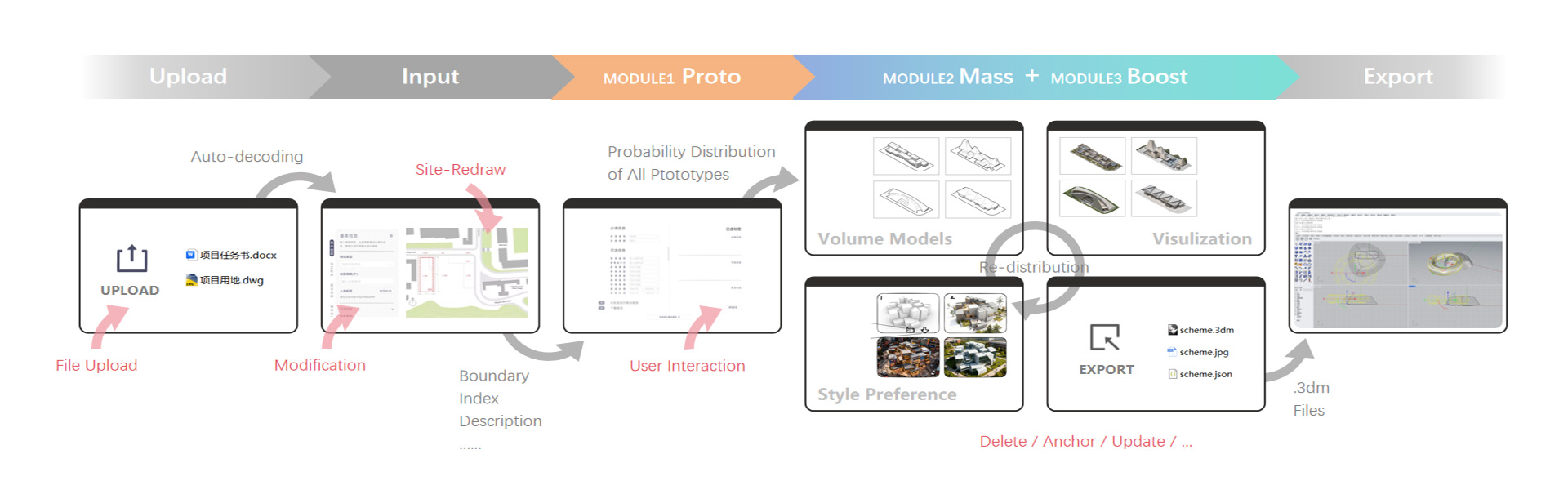 ProtoMass建筑体量原型智能演绎工具是华建科技数字化所与华东院创作中心合作的数字化开发项目,旨在为原创设计师提供自动化交互式的初步体量方案生成服务。我在项目中担任技术负责人。从设计问题梳理,到整体技术路线的制订,